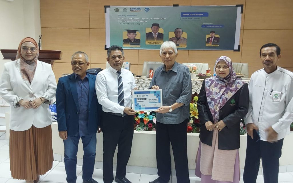 Narasumber Prof. Jusman Iskandar menjelaskan pentingnya pemahaman yang jelas tentang istilah “Social Worker” dan “Pekerja Sosial.” Ia menegaskan bahwa predikat “Social Worker” diperoleh melalui pendidikan formal, bukan sekadar bimbingan sosial atau menjadi relawan sosial di masyarakat.